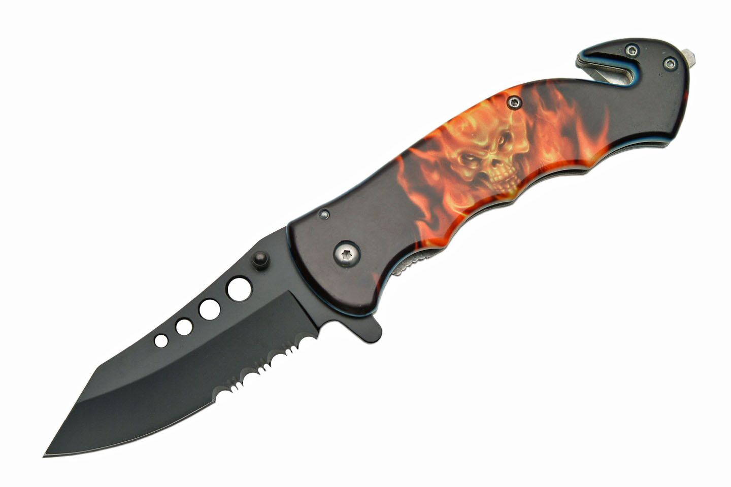 Aluminum handle with flaming skull printed with a seat cutter & glass breaker