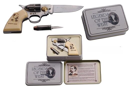 A Great Collectible Wyatt Earp Gun Knife Set comes with Folding revolver & a .44 Bullet knife, & a Deluxe Tin Box display.